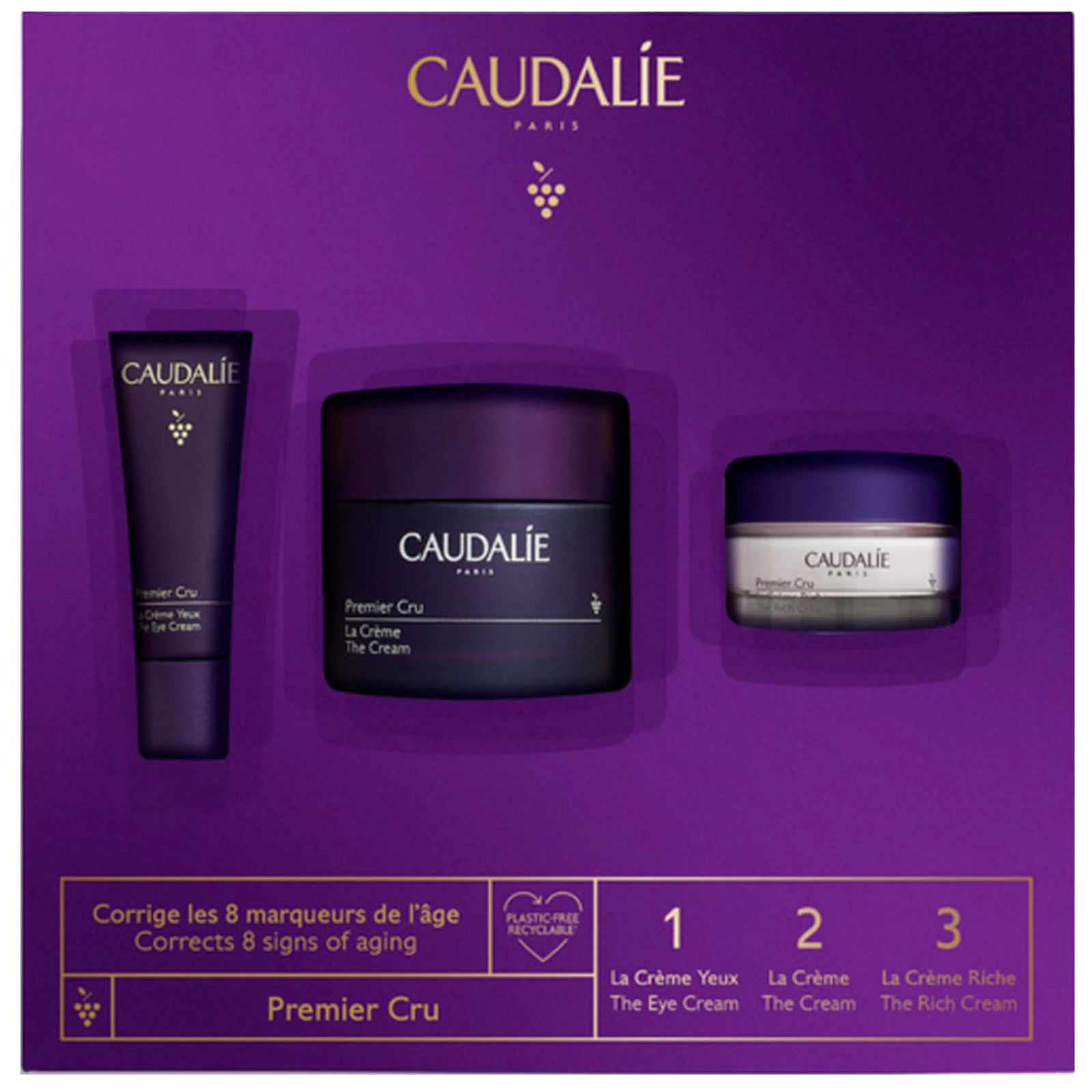 Caudalie premier cru gift set is a limited edition gift set that contains Premier Cru The Cream 50ml 1.6fl.oz (full-size) + 2 free travel-size products from the same collection to complete your routine: The Rich Cream and The Eye Cream.