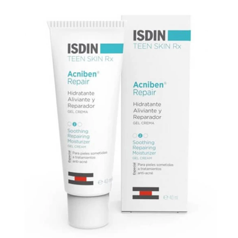 Isdin acniben repair moisturizer and repairing gel cream… Isdin acniben repair moisturizer and repairing gel cream is a face care that helps reduce dryness, irritation and peeling, indicated for the specific care of skin undergoing anti-acne treatments. After a gentle cleansing it is necessary to relieve and restore fragile skin by anti-acne treatments. Moisturizes intensely and prolonged thanks to its specific formula with calmaactive, glycerin and hyaluronic acid. Quick absorption without leaving greasy residues. No perfumes or preservatives.