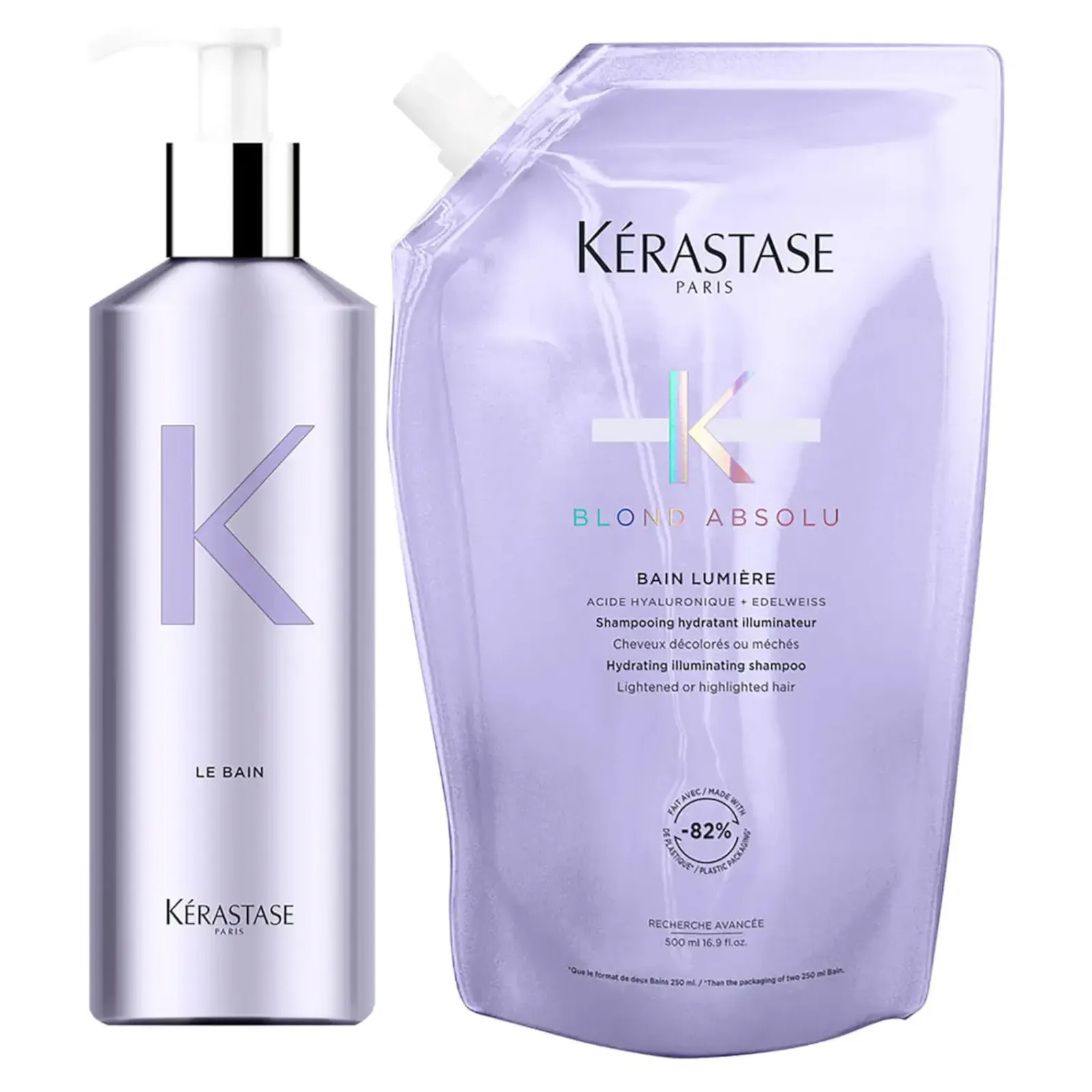Kérastase blond absolu bundle includes 2 products from the brand’s luxurious sustainability line: the aluminum bottle & Kérastase blond absolu bain lumiére shampoo refill.