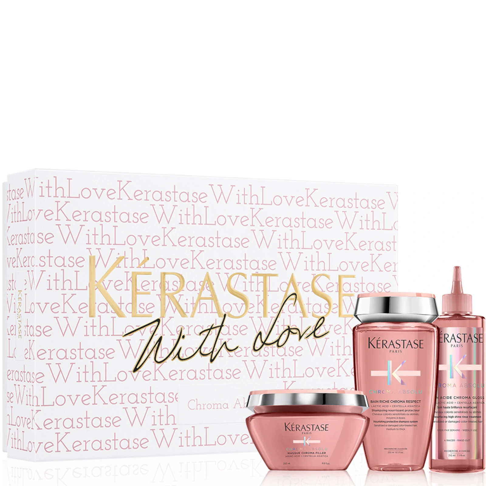This gift set includes the Kérastase Chroma Absolu Shampoo For Color-Treated Hair Fine To Medium 250ml, the Kérastase Chroma Absolu Masque For Color-Treated Hair 200ml, and the Kérastase Chroma Absolu Soin Acid High Shine Treatment Color-Treated Hair 210ml.