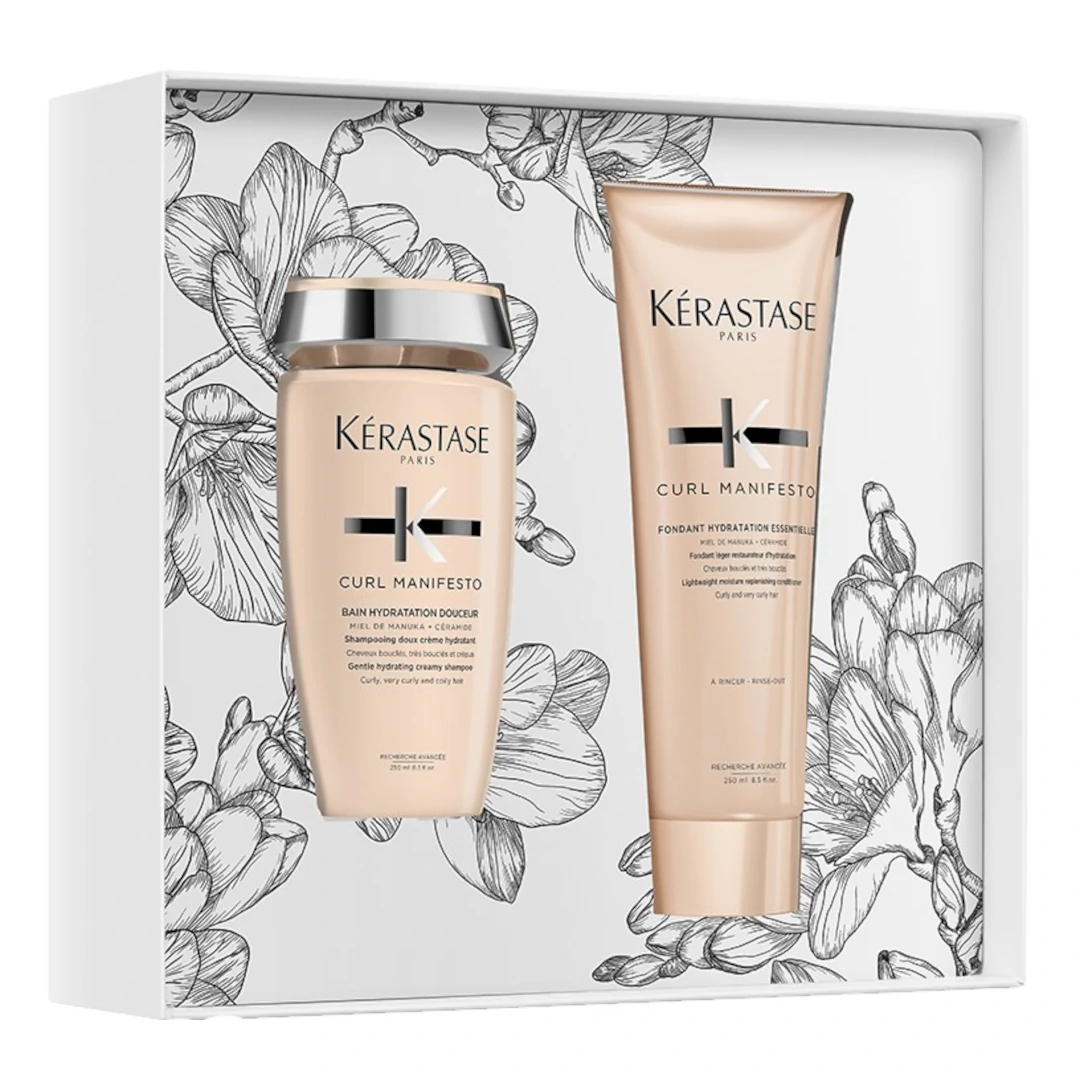 Kérastase curl manifesto coils and curls gift set is your hair ritual for curly hair. This duo set includes the Kérastase Curl Manifesto Gentle Hydrating Creamy Shampoo For Curly Hair 250ml and the Kérastase Curl Manifesto Lightweight Moisture Replenishing Conditioner For Curly Hair 250ml.