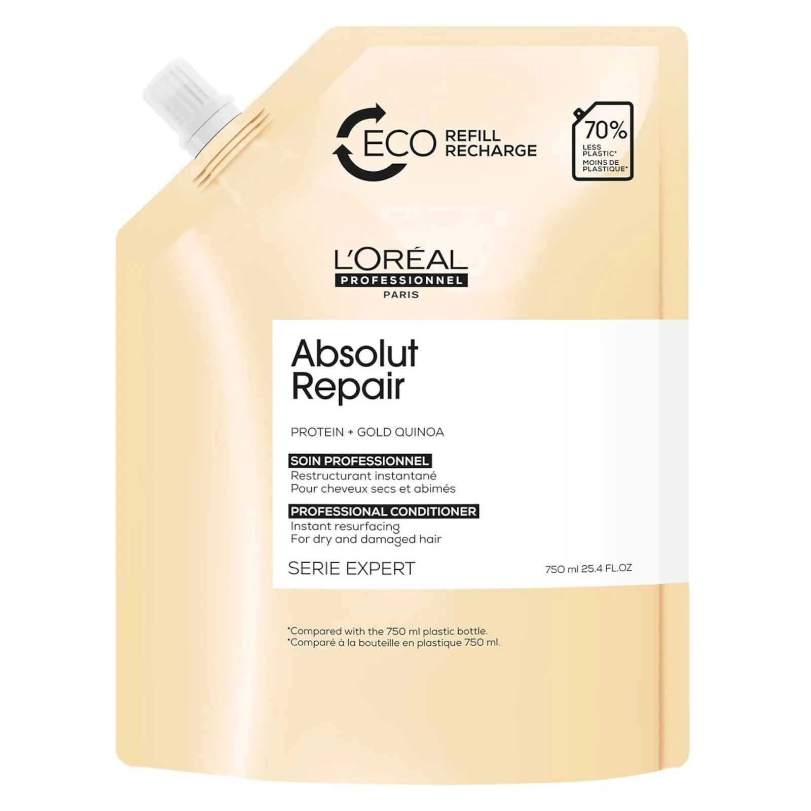 Loreal professionnel absolut repair shampoo refill in an eco-rechargeable format with 65% less plastic. This is a shampoo with a professional formula to wash and nourish really damaged hair.