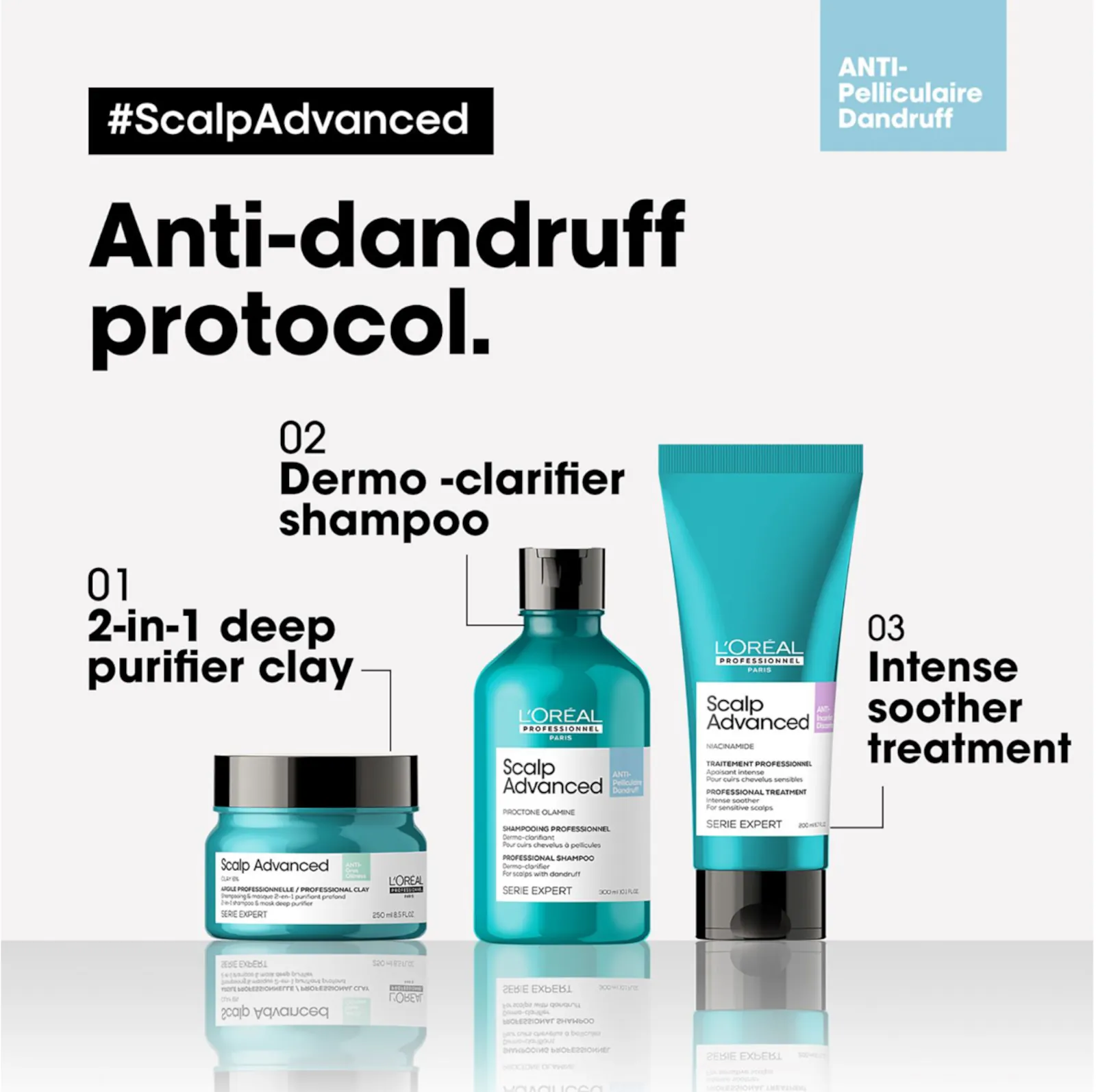 The scalp is like skin, but much more complex. This is why the oxidation of sebum and micro-cracks in the scalp’s surface can create numerous problems, such as dandruff. Dandruff is characterized by an increase in the natural flaking of the scalp that leads to a visible buildup of flakes. Since it is mainly due to an imbalance in the capillary flora, the Loreal professionnel scalp advanced line aims not only to remove dry and oily dandruff but also to restore balance and soothe the scalp. While imparting an invigorating cleansing sensation.
