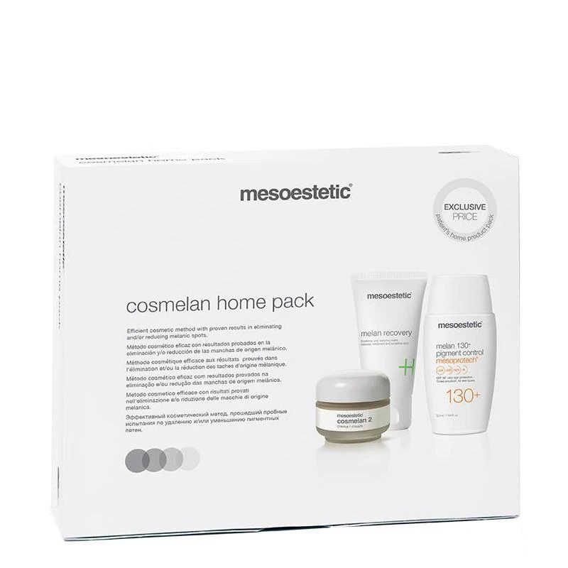 Mesoestetic Cosmelan Home Pack combines the 3 essential products to treat hyperpigmented spots. Therefore, it includes Cosmelan 2 cream 30g, Melan Recovery 50ml, and Melan 130º Pigment Control 50ml.