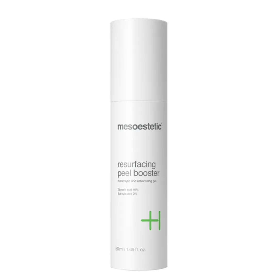 Mesoestetic Resurfacing Peel Booster is a gel used at night, with retexturizing, smoothing and seborregulatory action. Indicated for oily skins, with excess production of sebum and acne imperfections. The Resurfacing Peel Booster Gel combines the skin renewing action of 10% concentrated Glycolic Acid with the keratolytic, comedolytic and anti-inflammatory action of Salicylic Acid at 2%. This retexturizing gel eliminates dead cells on the skin surface and smoothes the roughness of the stratum corneum. This product decreases pore size by fluidizing the sebum and by its descaling action. It minimizes imperfections and comedones, reducing the appearance of pimples and blackheads. Resurfacing Peel Booster also has anti aging action, being an excellent anti aging for oily skin, due to its ability to stimulate cell renewal, to attenuate the depth of wrinkles and to smooth the skin. Gradually the skin becomes softer, homogenous, controlled and mafic.