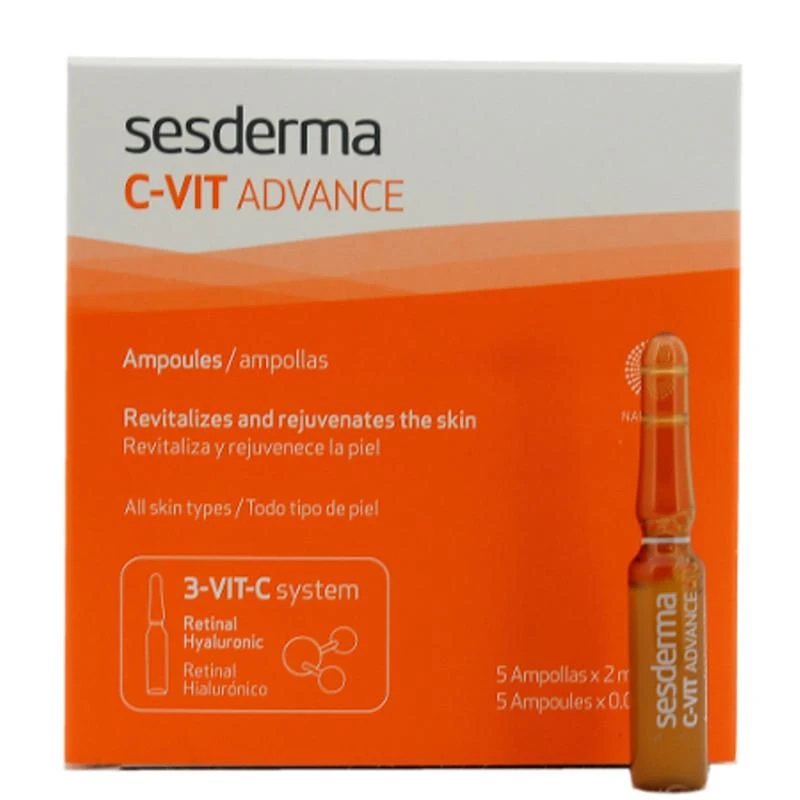 Sesderma C-Vit Advance Ampoules contains in its formulation the Vit-C 3 system (free ascorbyl glycoside, ascorbic acid ethyl liposomes, liposomal sodium ascorbate), liposomal retinal hyaluronic acid and niacinamide.